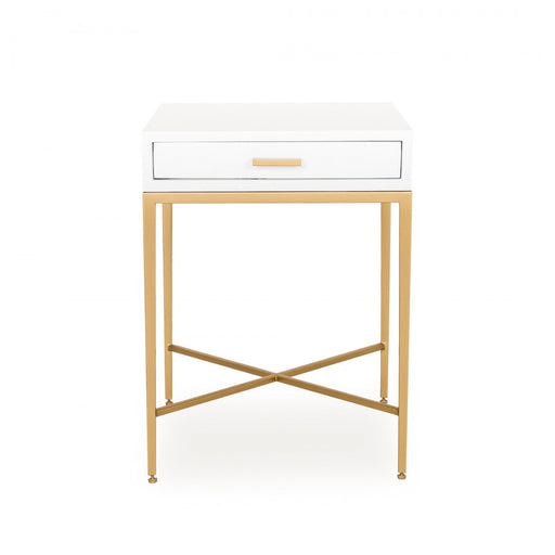 Di DesignsOne drawer white bedside table, 50% high gloss finish, fine tapered gold finished legs, cut lines, metal runners on drawer, gold finish bar handle ...
