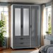 The Madrid 3 Door 2 Drawer Mirrored Wardrobe in Grey and White Gloss offers a sleek and spacious storage solution. Featuring a modern high-gloss finish, full-length mirror, two handy drawers, and generous hanging and shelving space behind three doors, it’s the perfect blend of style and practicality for a contemporary bedroom.