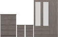 Elevate your bedroom with the sophisticated Nevada Bedroom Set in Black Wood Grain. This stunning set features a 3 Door 2 Drawer Mirrored Wardrobe, a spacious chest of drawers, and two matching bedside tables. The rich black wood grain finish adds depth and character, while the mirrored doors enhance light and space in your room. Combining practical storage solutions with sleek style, this set is perfect for a contemporary bedroom look.