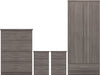 Elevate your bedroom with the bold and contemporary Nevada Bedroom Set in Black Wood Grain. This stylish 4-piece set includes a 2 door 1 drawer wardrobe, a chest of drawers, and two bedside tables – perfect for adding sleek storage and a modern edge to your space.