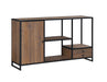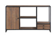 - Features two drawers, a cupboards, and open shelving for display and storage
