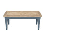 • The Signature Blue collection features meticulous craftsmanship in the hand-finishing process. The oak parquet top undergoes a delicate distressing, followed by the application of a thin layer of white paint that is meticulously hand-rubbed back. The final touch involves a resilient clear lacquer, resulting in a breathtaking and durable appearance.