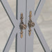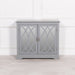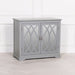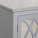 Grey two-door cupboard with a mirrored ornate front design and detailed handles featuring internal shelves.