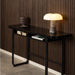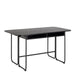 This contemporary dining table combines functionality and style. Its ash black top and shelves, paired with a sturdy matte black steel base, offer ample storage and a sophisticated look, complete with convenient extension leaf storage.