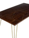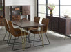 This elegant dining table is offered in a rectangular shape, it can comfortably accomodate 6 people and it is stained in a dark walnut finish, featuring gold metal inlays on the table top, complemented by gold metal legs. Table top thickness: 3 cm