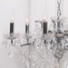 Six branch French-style shallow chandelier in a chrome finish metal frame with polished, clear-cut glass droplets and an adjustable chain.