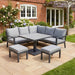 Create the perfect space for outdoor dining and relaxation with this stylish aluminium corner dining set. Featuring a sleek, contemporary design with durable aluminium frames and soft grey cushions, it offers both comfort and long-lasting performance. The spacious corner sofa provides plenty of seating, while the sturdy central dining table is ideal for meals, drinks, and social gatherings. Two matching stools add extra seating or can be used as footrests for added versatility.