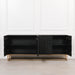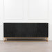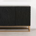 Black painted 4 door sideboard with a contemporary wooden carved ripple / wave effect pattern front design doors featuring internal shelves and metal gold base.
