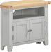 This space-saving corner TV unit combines a soft pebble grey-painted frame with a warm oak-effect top, offering a stylish solution for compact living areas. Crafted from durable materials, it features an open central shelf for media devices and two concealed cupboards for additional storage. Its compact design ensures a snug fit into corners, maximizing floor space while providing ample storage. The combination of neutral tones and practical design makes it a versatile addition to various interior styles.