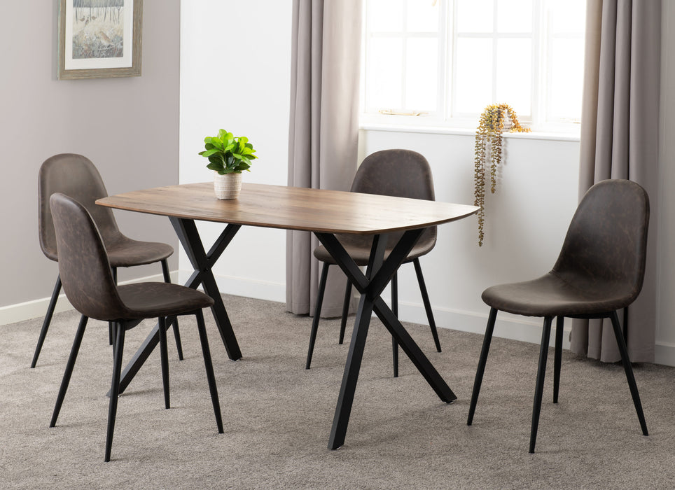Bring warmth and modern style to your dining space with the Athens Dining Set. Featuring a rectangular medium oak-effect table with a sleek black frame and four comfortable brown faux leather chairs, it’s the perfect blend of practicality and contemporary charm.